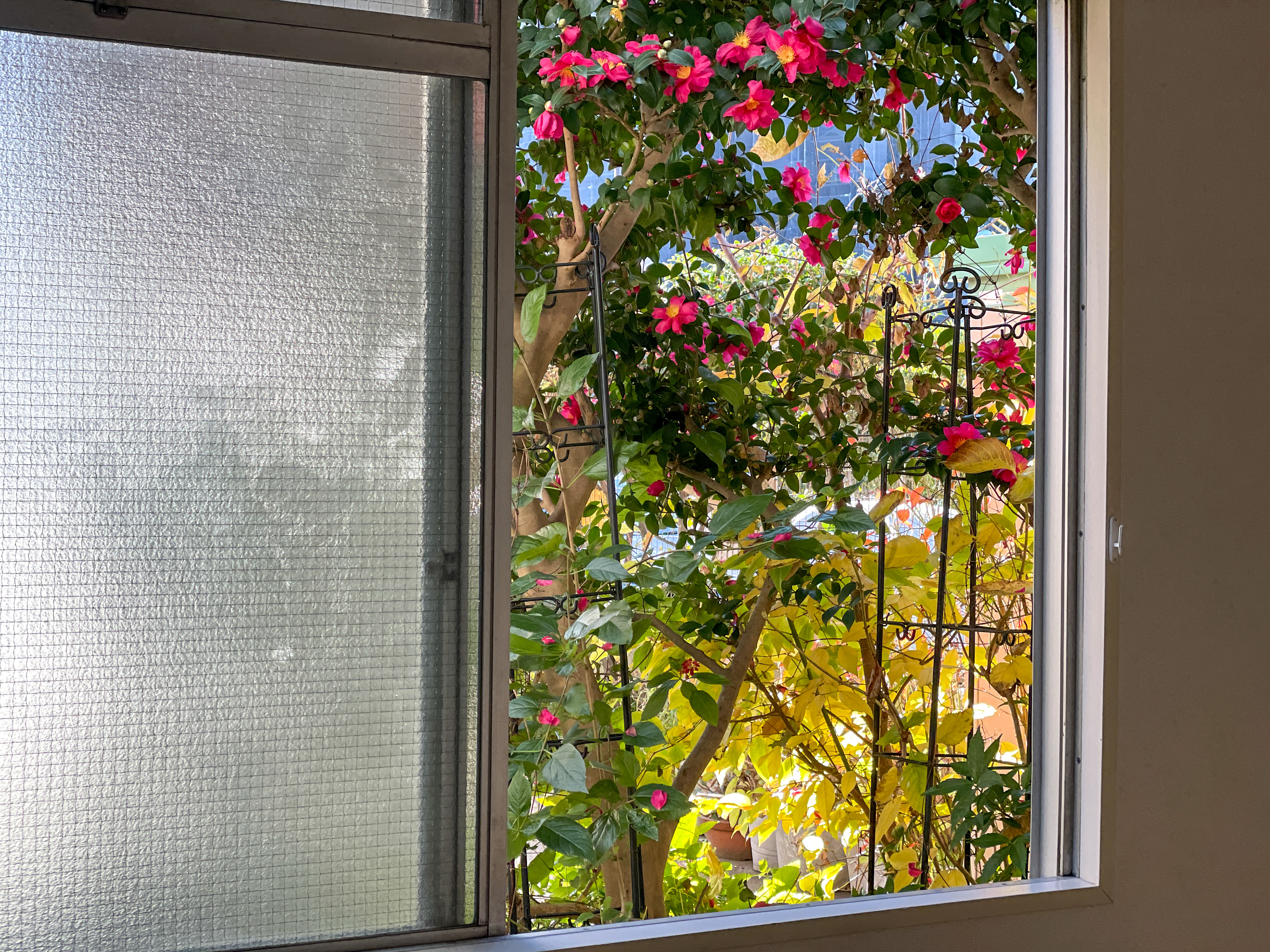 窓のフレームで切り取られた緑とお花。