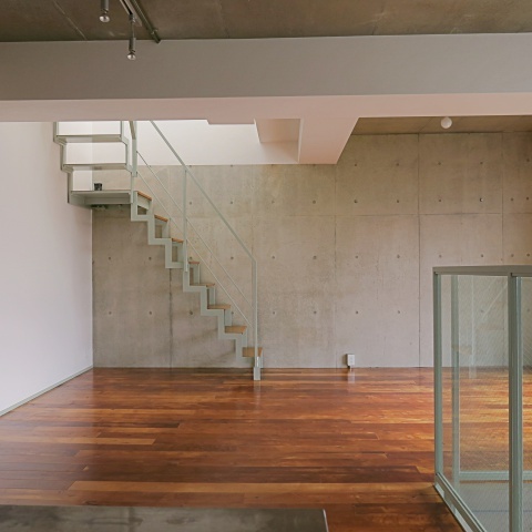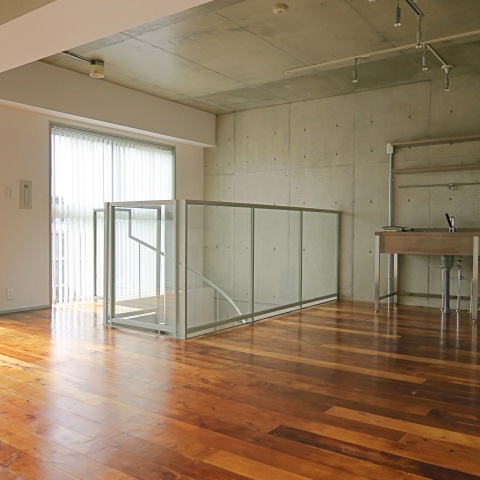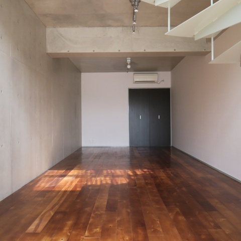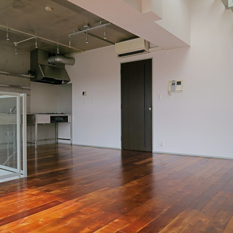 シックな色合いの無垢フローリングにコンクリートの高い天井