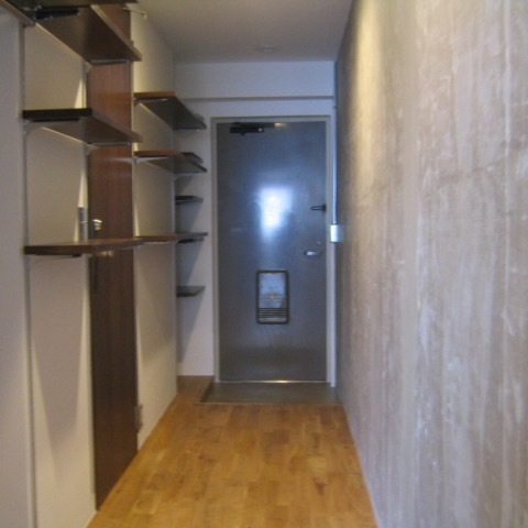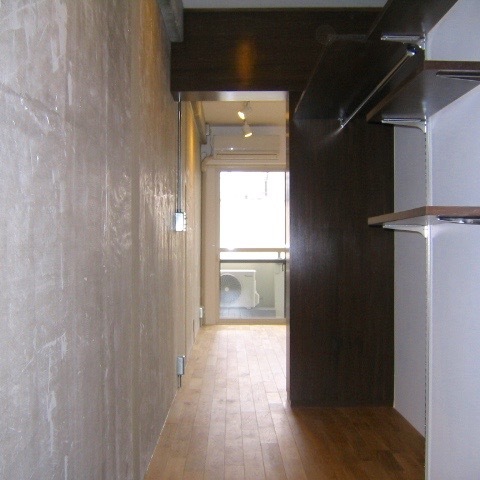 廊下に沿って続く木製の棚。