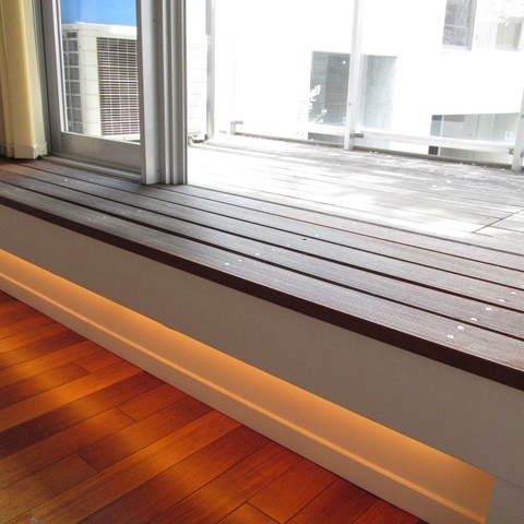 そして、ベランダがウッドデッキになっていてお部屋の部分にもベンチ感覚で一段高くなっています。