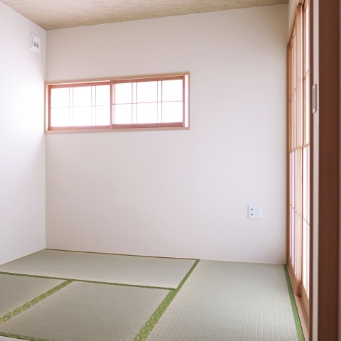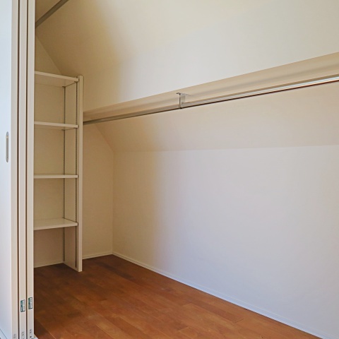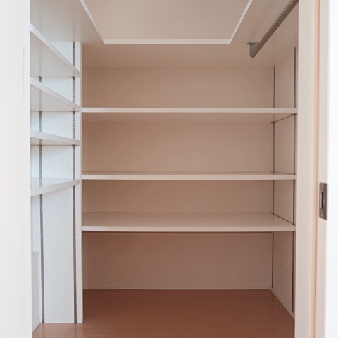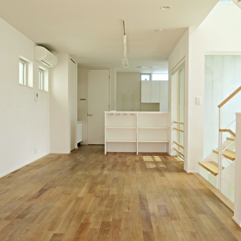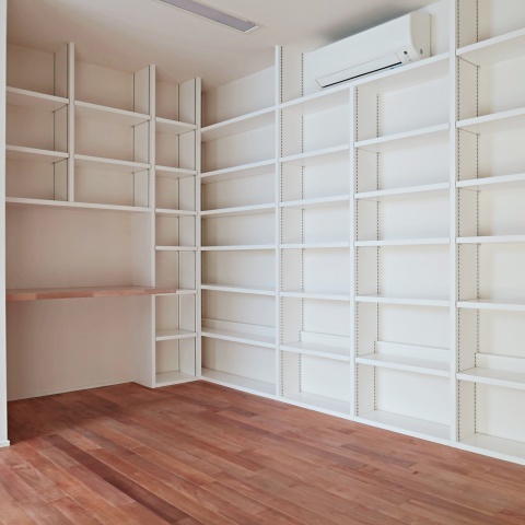 1階は広い玄関と壁一面の収納棚がある書斎スペース