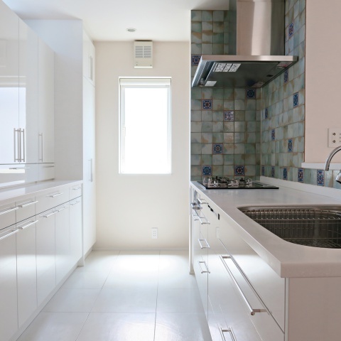 深いブルーが落ち着くバスルームは大きな窓からの光で