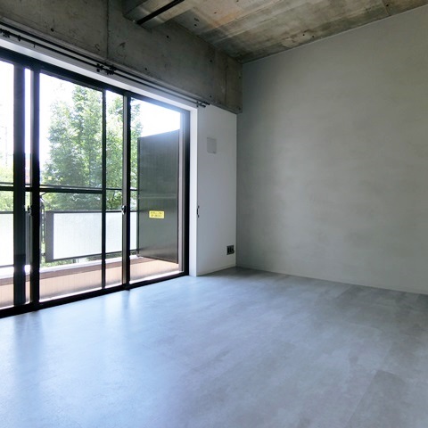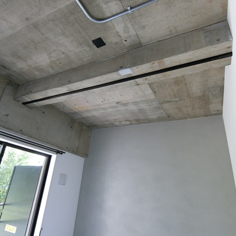 お部屋は配管むき出し、コンクリートむき出しの天井が