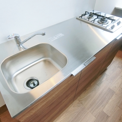 2口ガスキッチンで、作業スペースも広いので使い勝手もよさそう。