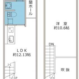 部屋はメゾネットタイプで、1階にはキッチンが配置された広い12帖の居間があり、綺麗なサニタリースペース、そして玄関があります。