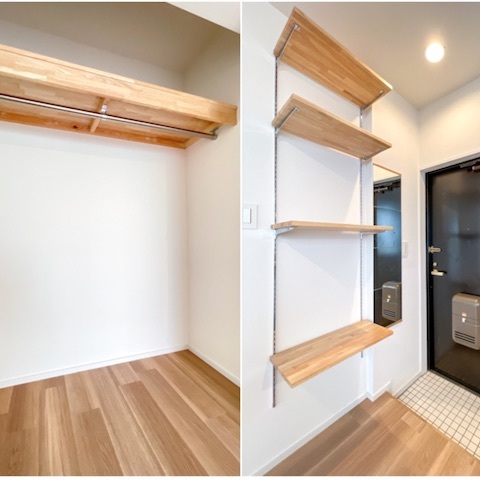 コートかけ、タイル貼りの土間、造作の靴棚などなど、、、