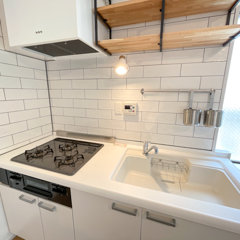 キッチンは人造大理石の天板の3口コンロのシステムキッチンを採用し