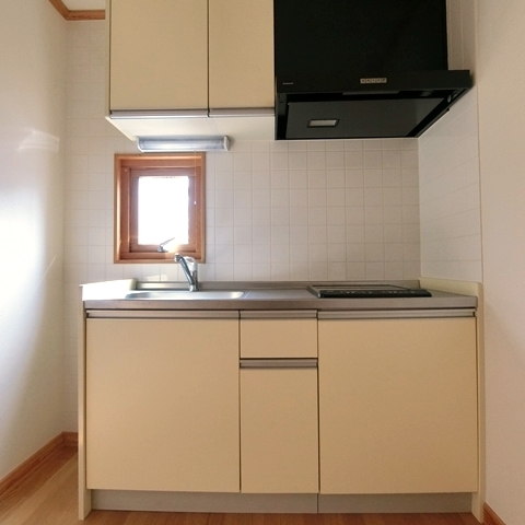 外階段を上り、鍵を開けて玄関に入ると目の前にはベージュ色の可愛らしいキッチン。