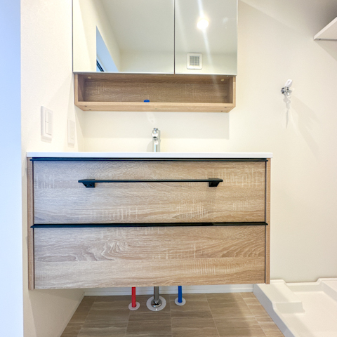 木の洗面台にはデザイン性と品の良さを感じます。