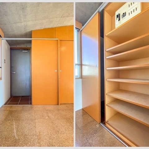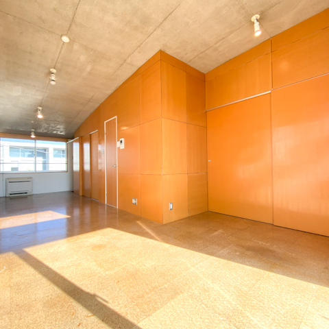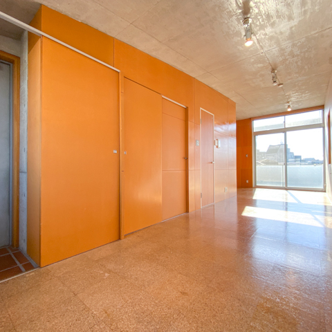 水回りやキッチンが全てオレンジの建具の向こうに目隠しされているので、生活感を出さずに過ごせますよ。