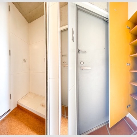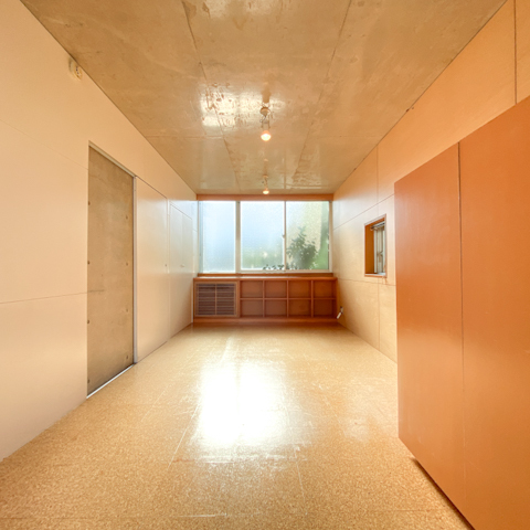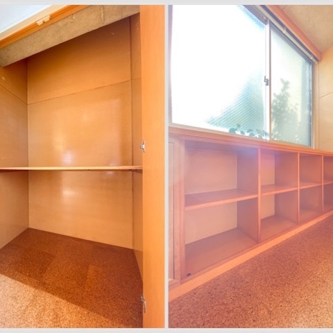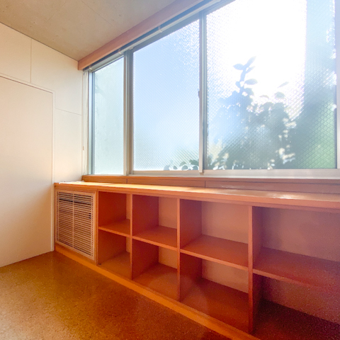 橙色と教室のロッカーみたいな棚のあるノスタルジックなお部屋のご紹介です。
