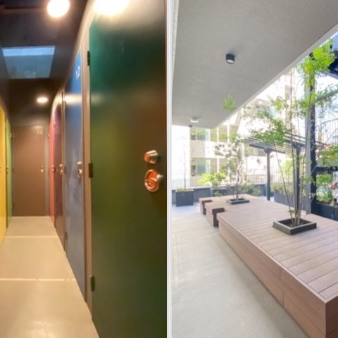 フロア共用部にはグリーンやベンチなどがあり、癒される空間に。