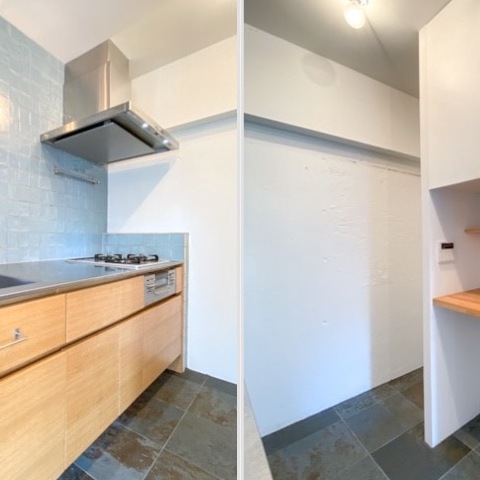 タイルや電球型の照明など見た目も素敵ながら機能も作業スペースも申し分なし!