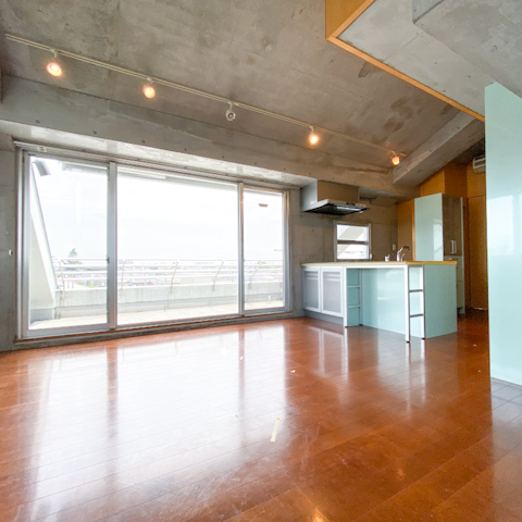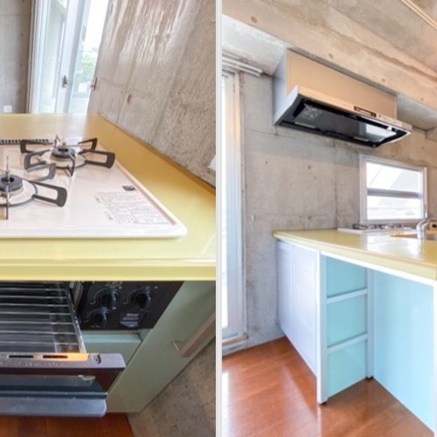 ちょっとワイルドな躯体晒しの壁と、キッチンまわりのポップカラーな備えつけ家具が絶妙なバランス。