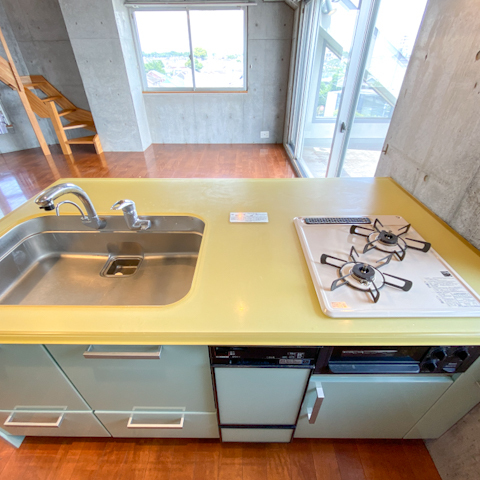 このカウンターキッチンは2口ガスコンロ、グリル付き、食洗機付きの最強スペック。お料理好きさんにぜひ使っていただきたいです!