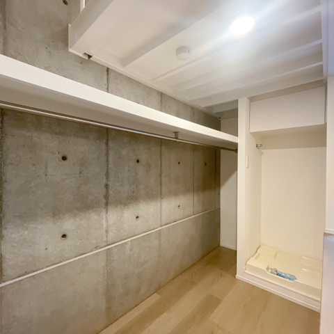 と思いきや階段を下った先はポールが通っていて洋服掛け放題。