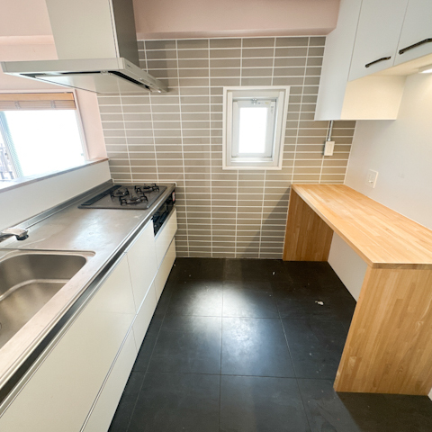 バルコニー用の大きな窓。その窓からの景色に対面するようにキッチンが作られているので、