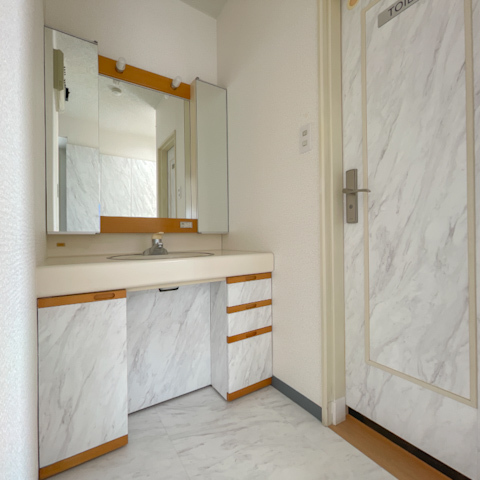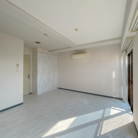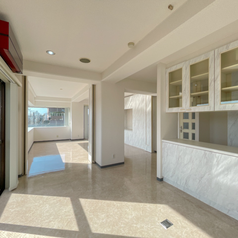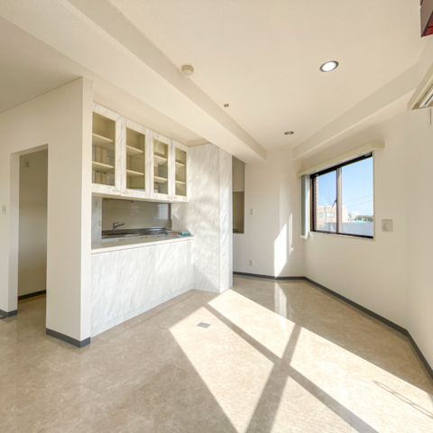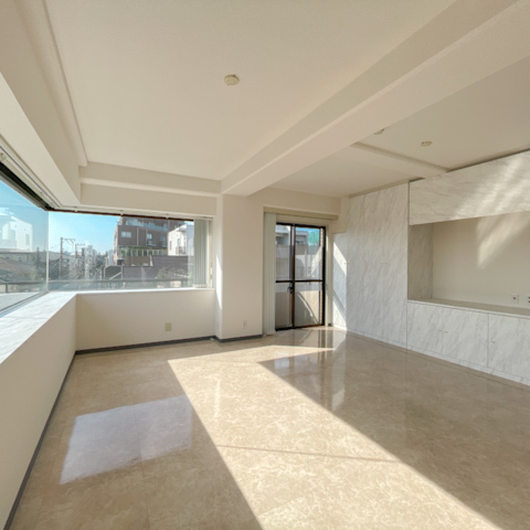大理石調の床が光を反射し、窓から差し込む陽光が部屋全体を明るく包みます。
