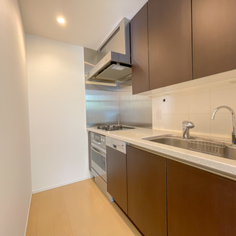 木目の美しい収納とシンプルなキッチンが調和し、余白を生かした空間は家具選びの楽しみを広げます。