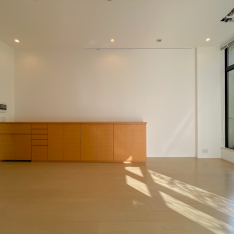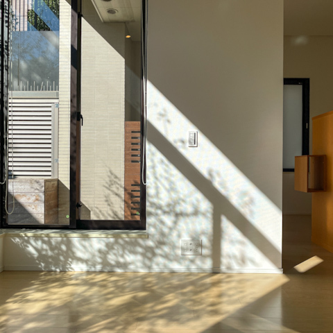 南西向きの大きな窓から差し込む光は、時間とともに表情を変え、床に映る木々の影が季節を語りかけるよう。