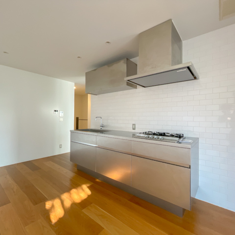ステンレスのフラットキッチンと白タイルの壁面が、料理の時間をアートに変えるような存在感を放ちます。
