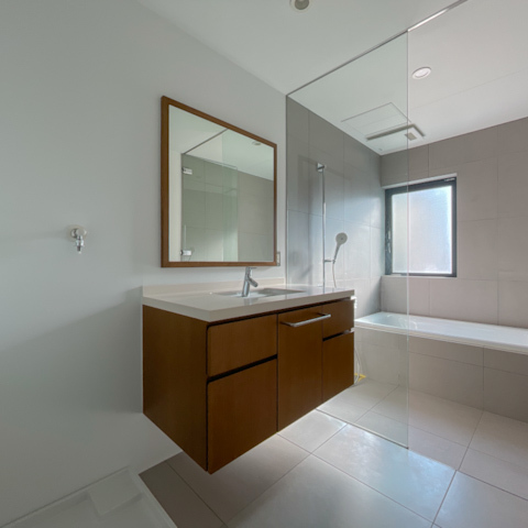 洗面台は木調キャビネットで温もりを添え、浴室はグレー基調でホテルライクな落ち着き。