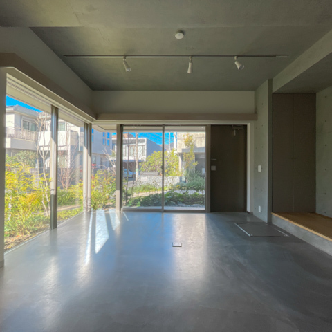 1階はコンクリート打ちっぱなしと大きなガラス窓に囲まれた開放的なスペース。