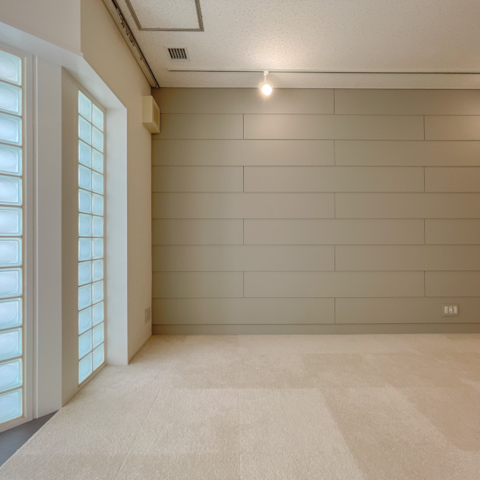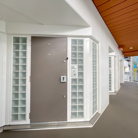 玄関を開けると目に飛び込むのは、ガラスブロックが並ぶ印象的なエントランス。