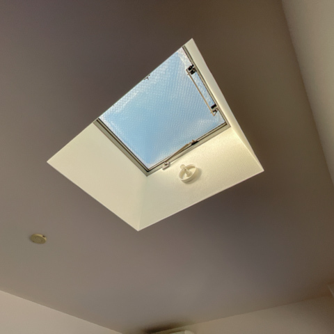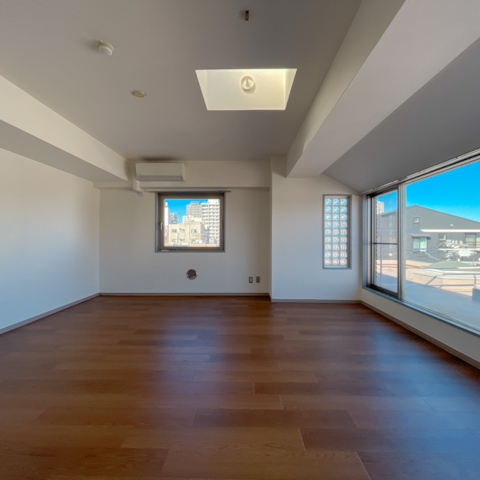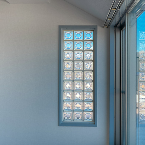 天窓やガラスブロックから差し込む柔らかな光が、白い壁と木目のフローリングに反射して、部屋全体を明るく心地よい空間に。