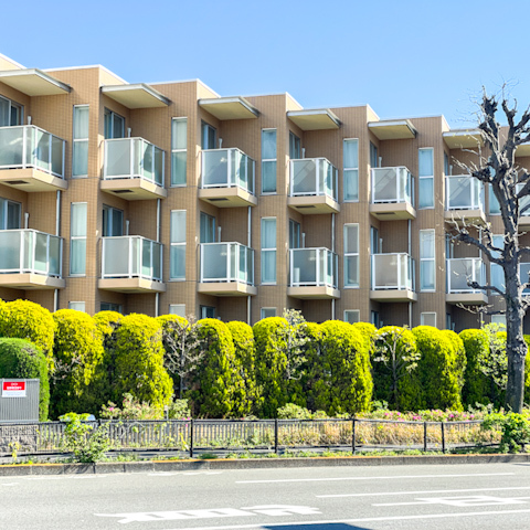 自由が丘からも12分ほど歩いた場所にある、環八沿いに建つバルコニーが突き出たような外観が特徴的なマンションです。