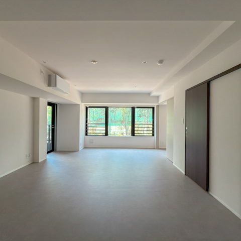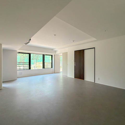 大きな開口部から差し込む自然光が、グレートーンの床をやわらかく照らし、空間全体に静かな明るさをもたらしています。