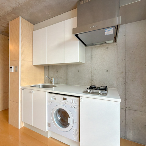 2口ガスコンロ付きのシステムキッチンには、ドラム式乾燥機も備え付け。