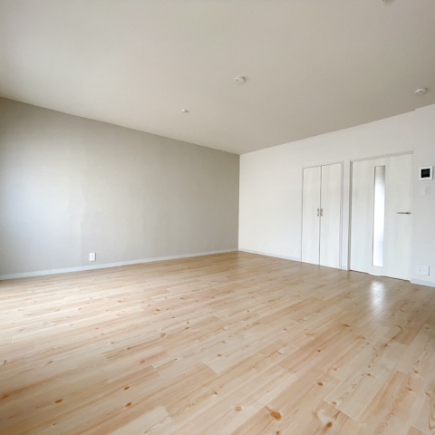 ナチュラルなフロアタイルにグレージュのアクセントクロスが優しい印象。