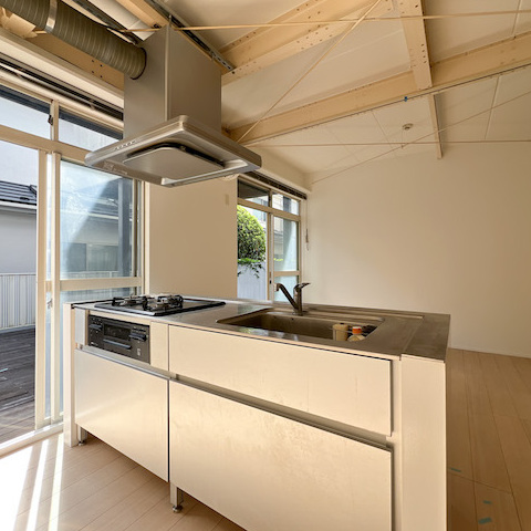 リビングから続くウッドデッキのおかげで空間が広く感じ、天気の良い日はここで食事を摂ることができそう。