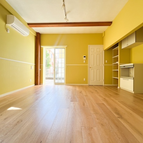 黄色の外壁が何とも可愛らしく、目を引くデザイナーズアパート