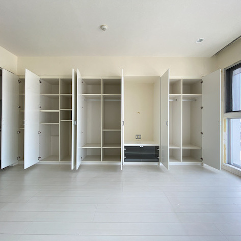 特筆すべきは、天井まで届くダイナミックな開口部。そこから注ぐ陽光が、日々の解像度を高めてくれます。壁一面に整えられた収納と造作棚のおかげで、生活感は最小限に。キッチンを奥に配した間取りは、お気に入りの家具やアートを主役にした自由なコーディネートを可能にします。