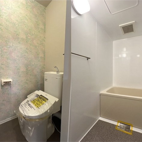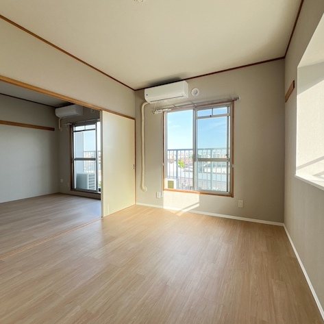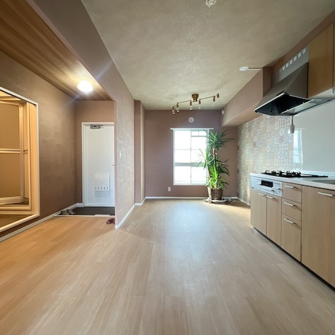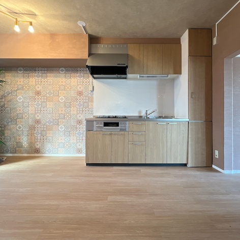 1984年築のお部屋はアクセントクロスや明るい色味のフロアタイルで