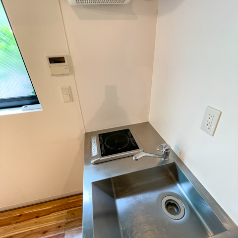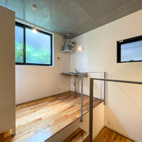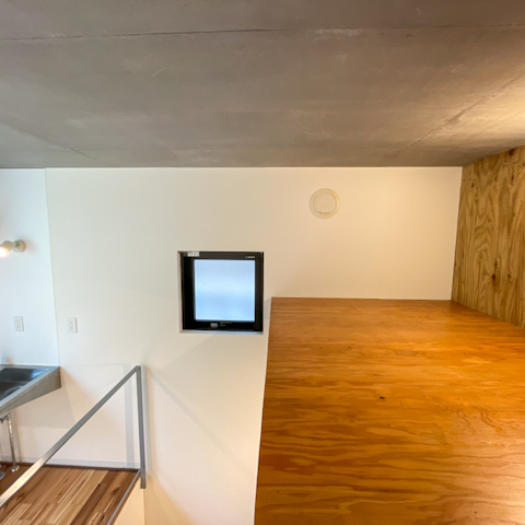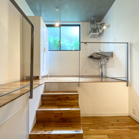 ロフト付きベッドルームにコンパクトなキッチン、数段降りればくつろぎスペース。