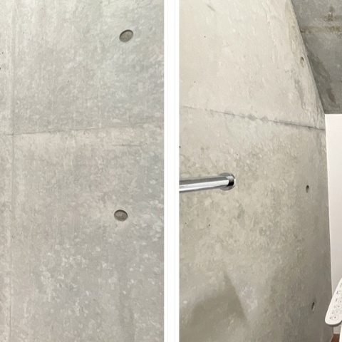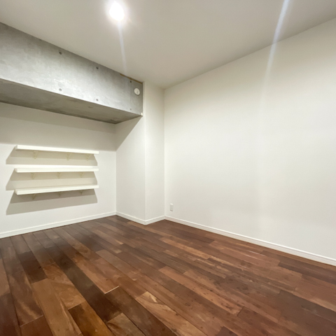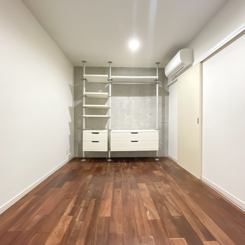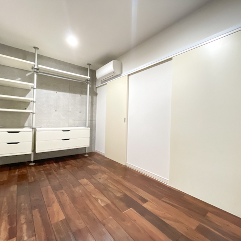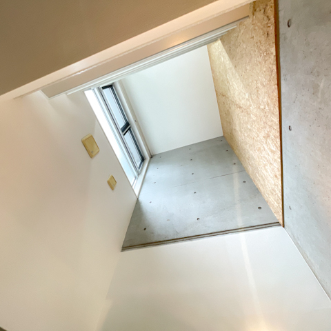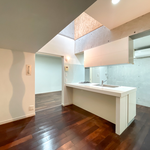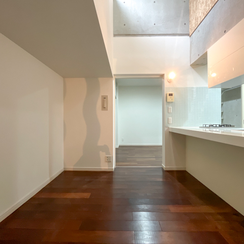 室内は光沢のあるダークトーンのフローリングに、打ちっぱなしコンクリートと白を基調にしたモダンな空間。