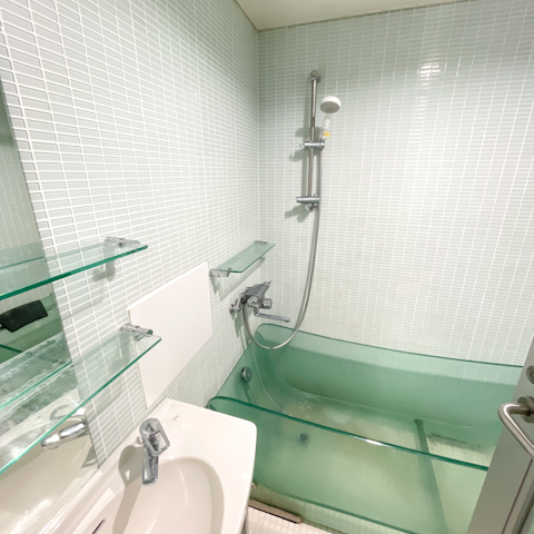 玄関を入って扉を開けると、タイル張りにガラスの浴槽のバスルーム。