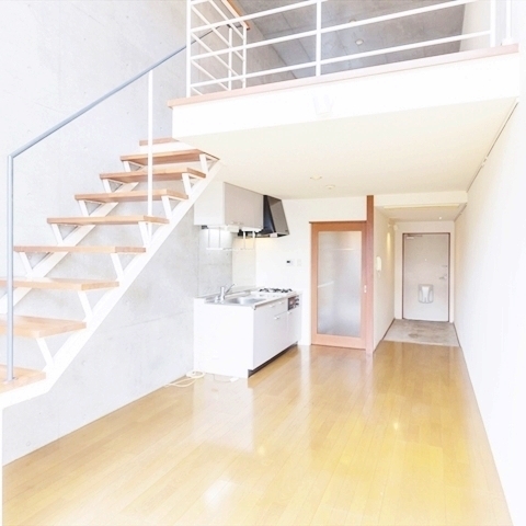 部屋はメゾネットタイプで、1階にはキッチンが配置された広い12帖の居間があり、綺麗なサニタリースペース、そして玄関があります。