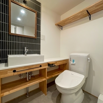 オリジナルデザインのキッチンと、洗面台にはタイルをアクセントに。