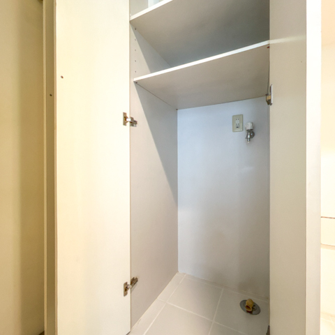 白い扉の奥にシューズボックスと室内洗濯機置き場。