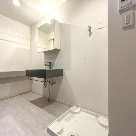 洗面台はデザイン性の高いスクエアタイプで、朝の身支度も気分が上がる空間に。