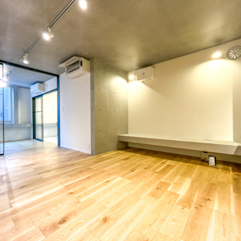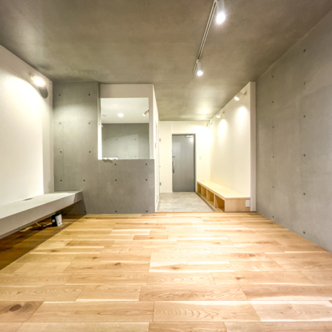 コンクリートの質感と無垢調フローリングが美しく調和した、