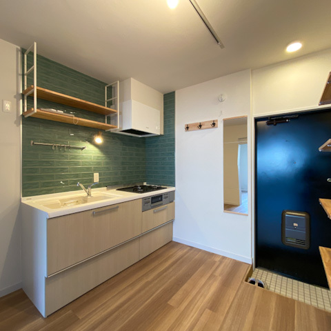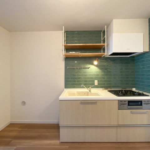 隣はダイニング、キッチンタイルの色はグリーンです。