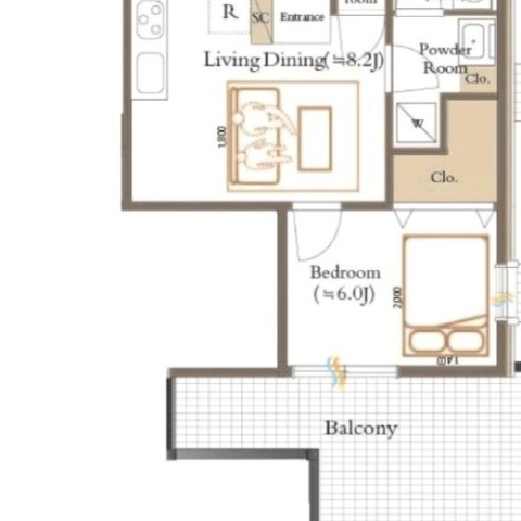 間取りは1DKタイプ。8帖ほどのテラスもあります。