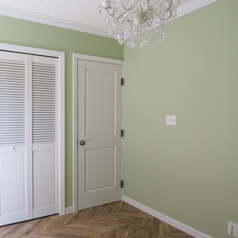 クリーミーなグリーンの塗装壁も、アメリカ感を助長し、