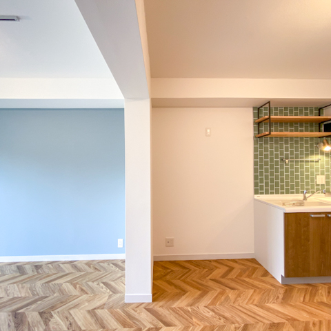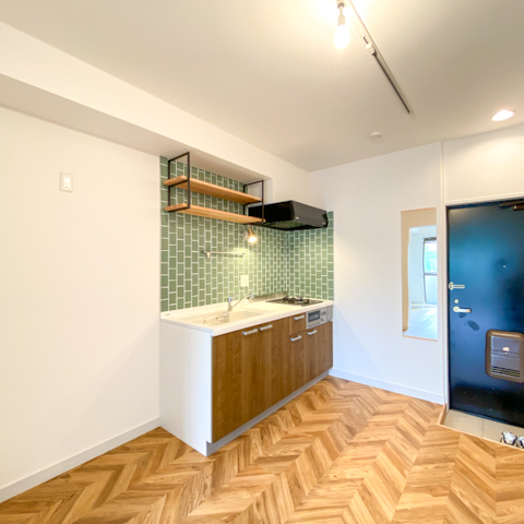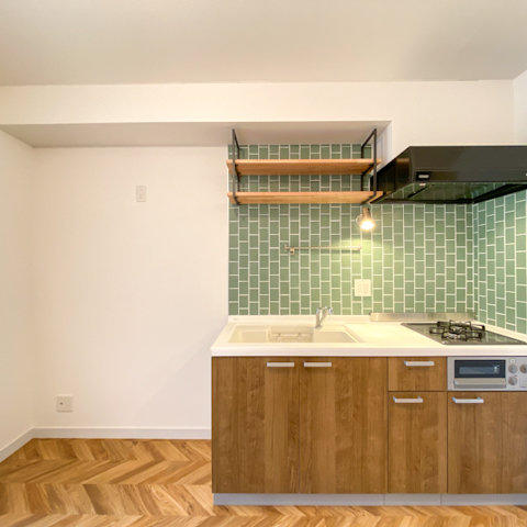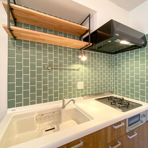 グリーンのキッチンタイルと、まるで外国のお部屋みたいに可愛い。