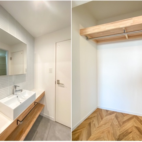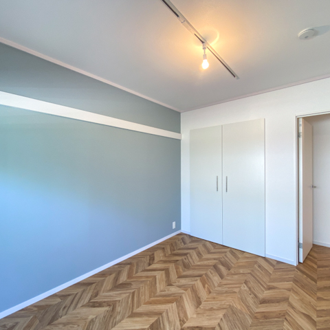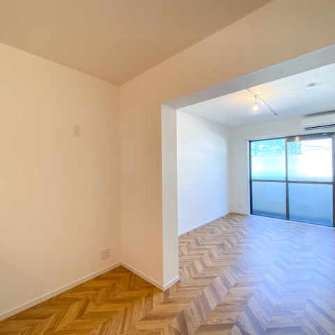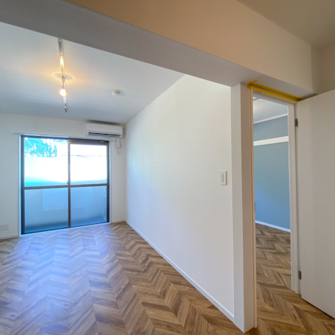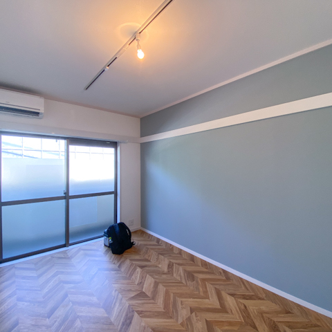 今回はヘリーンボーン柄の床に寝室は水色のクロス。